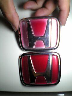 <エンブレム裏のシールをはがし、ペタっとはりつけ。 新旧で並べて見ましたが、明らかに赤が綺麗になりました(^^) 写真左から、古い、新品、並べたものになります。 やっぱ新しいのは気持ちが良いですね。 |