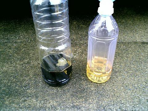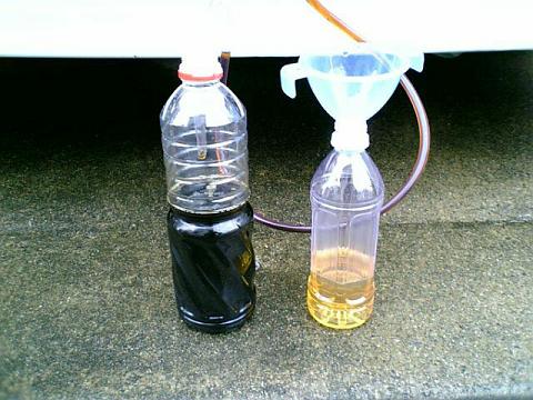 ![]() TYUEEEEEEEEEEN。 「おおー吸う吸う〜」 かなりの轟音で作動するチェンジャー。 がんがん吸ってます。 20秒ほどでリザーバー内は空になりました。 ちなみに、廃油と新油の比較。 汚すぎですね(^^; |