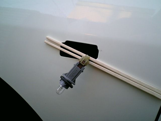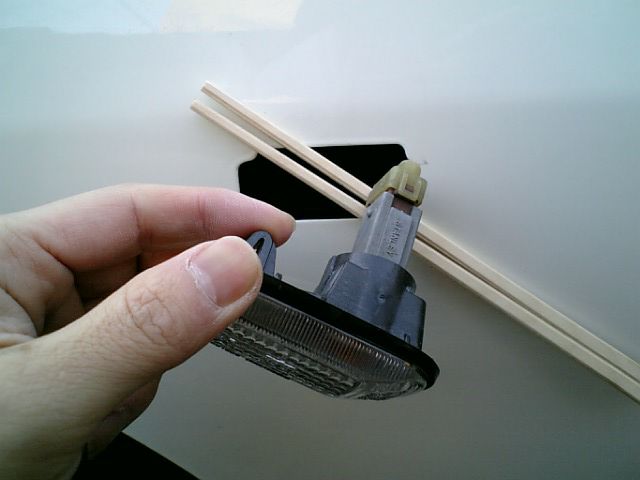 ![]() このまま気を抜くと、電球のソケットがフェンダーの中に・・・。 なんて事が起きないように、コードの部分に割り箸を差しこみ コードが中に入らないように留めておきます。 なかなか良いアイディアかなぁ〜(^^) |